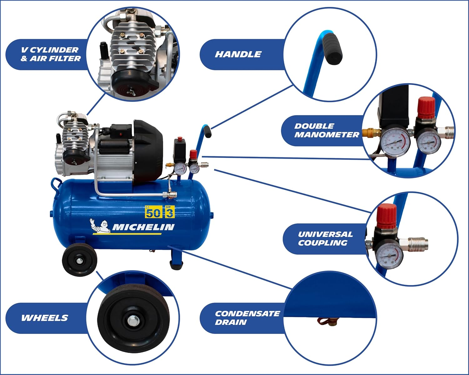 Compresseur d’Air Portatif MICHELIN MB3650 – Cuve 50 L – Moteur 3 CV – 10 Bar – 360 L/min