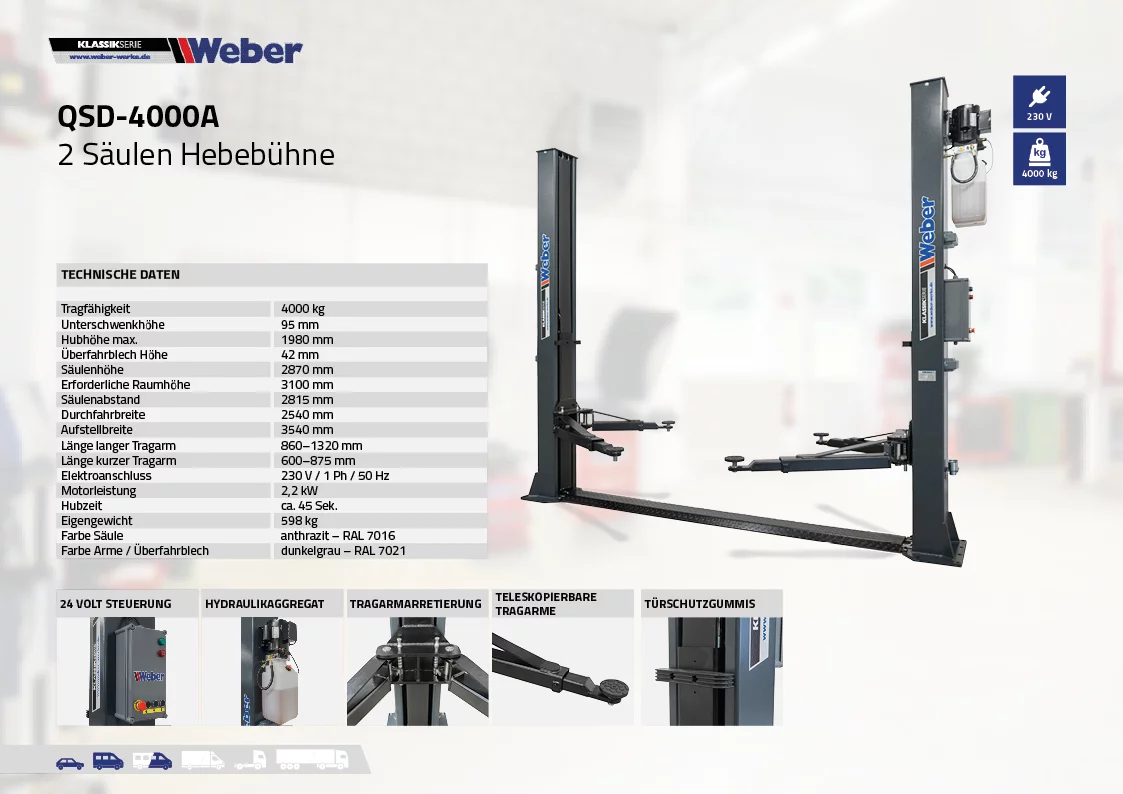 Pont élévateur à 2 colonnes Weber Série Klassik QSD-4000A avec ancrage et huile inclus
