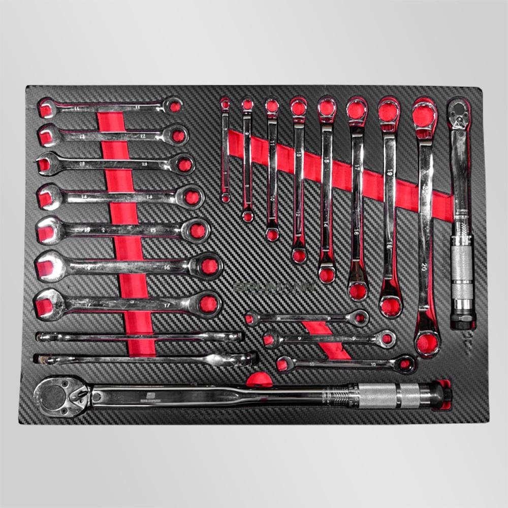 Elle se distingue par sa peinture métallisée vernie et ses glissières de tiroirs renforcées, assurant à la fois robustesse et longévité. Les modules en mousse moulée avec finition carbone offrent un rangement optimal tout en ajoutant un look raffiné à l’ensemble.