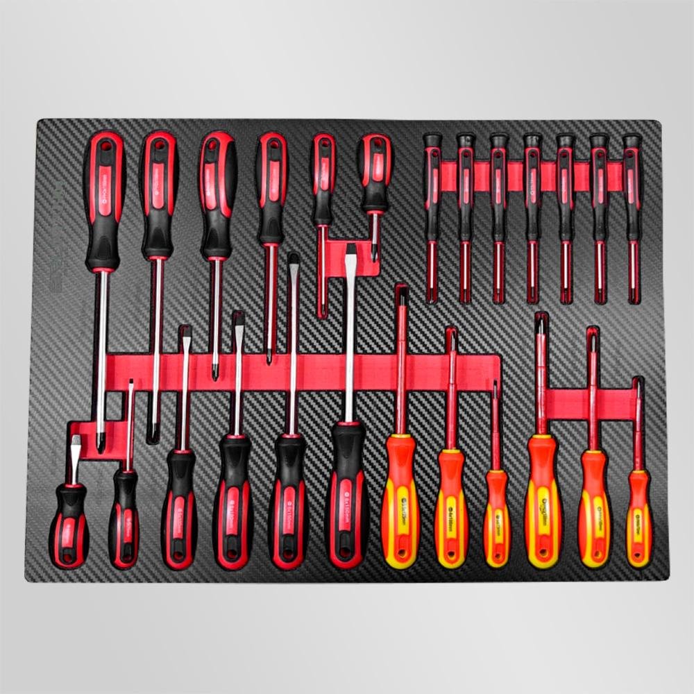 - 4e tiroir : Assortiment de tournevis cruciformes, plats, isolés pour électriciens et de précision.
