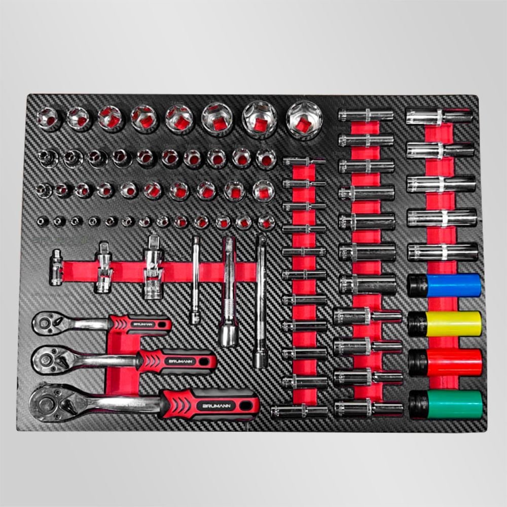 - 1er tiroir : Lot de 3 cliquets 1/4″, 3/8″, 1/2″ avec douilles courtes, longues, rallonges, cardans + 4 douilles choc avec bague téflon (douilles de 16 et 18mm incluses).